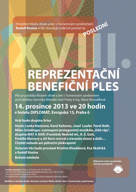 Touto cestou Vás chceme pozvat 14. 12. 2013 na poslední XVIII. benefiční ples v hotelu Diplomat na Praze 6 a požádat o podporu této neziskové organizace. Výtěžek z akce bude věnován Klubu dívek a žen s Turnerovým syndromem. Ples zaštítila starostka Městské části Prahy 6 Ing. Marie Kousalíková, děkujeme!