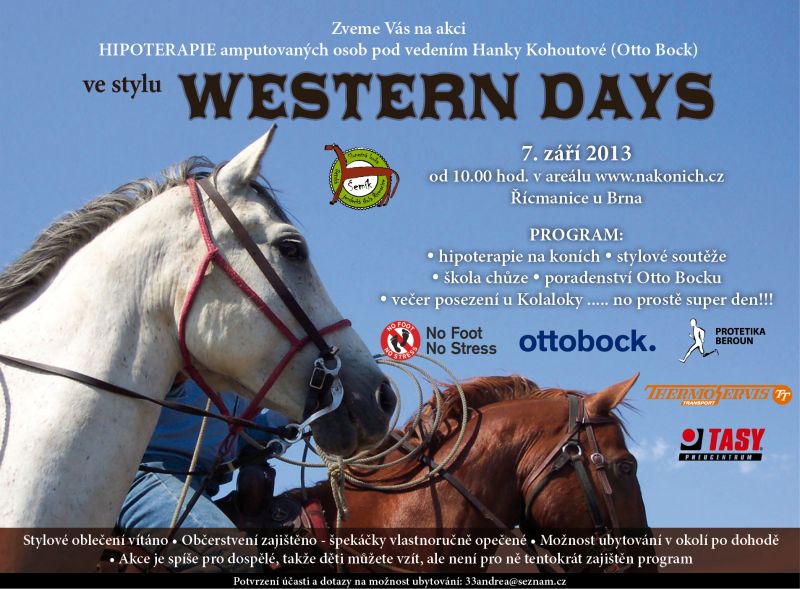 Nezisková organizace NFNS zve 7. 9. 2013 všechny amputáře na hypoterapeutickou akci ve westernovém stylu. Tato zářijová akce se koná kousek od Brna v areálu www.nakonich.cz. Kdo bude chtít zajistit ubytování, dejte včas vědět: